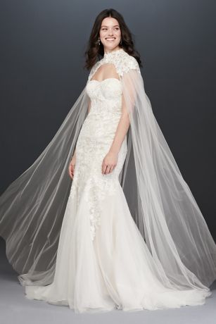 Long Tulle Cape With High Neck Lace Detail David S Bridal
