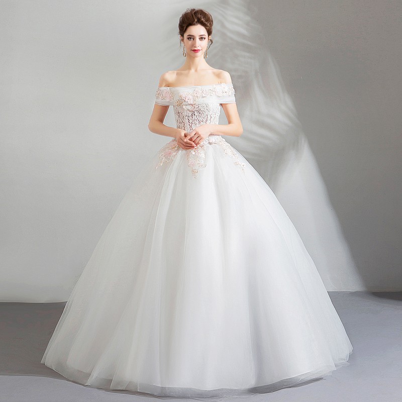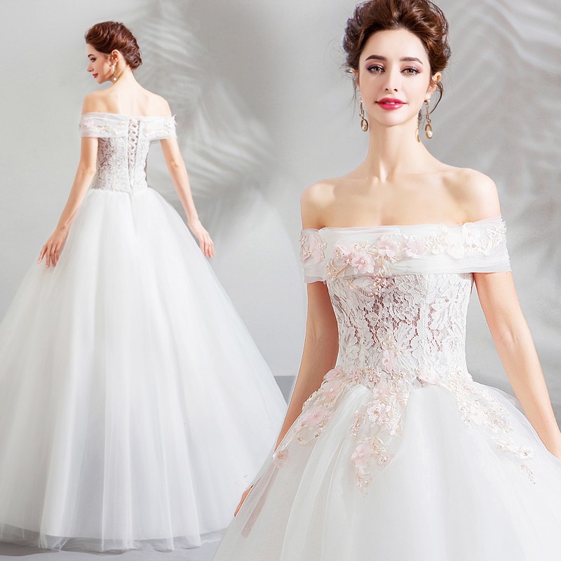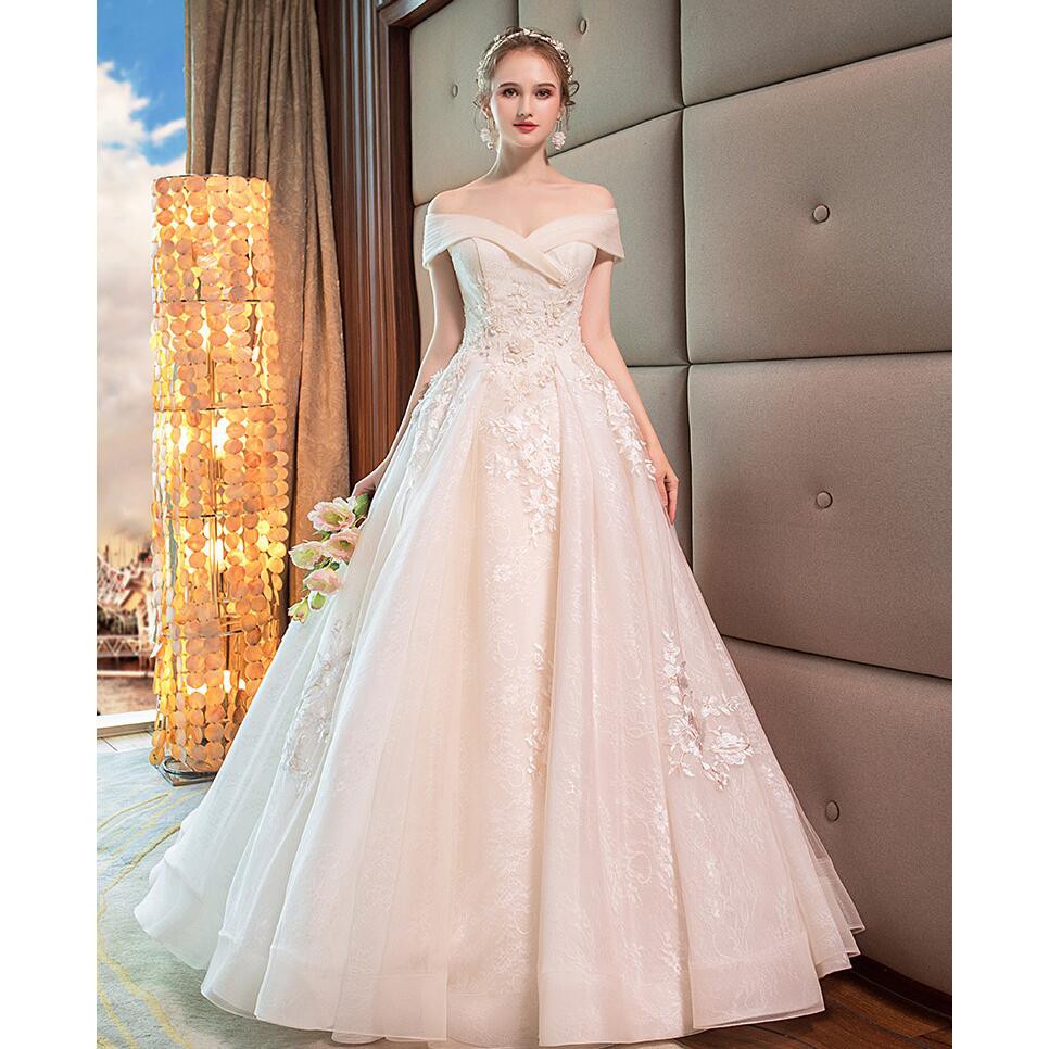 Off Shoulder Elegant Lace Flower Embroidery Wedding Gown Evening