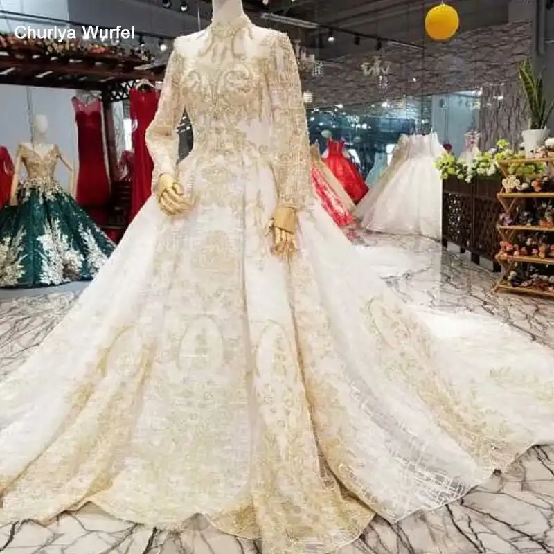 Ls410065 Luxury Golden Lace Dubai Wedding Dresses High Neck Long