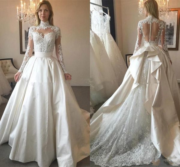 Vintage Long Sleeve Lace High Neck Wedding Dress Satin Bridal Gown