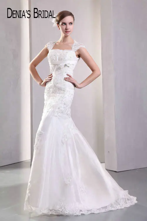 Cap Sleeves V Neck Mermaid Lace Wedding Dresses With Keyhole Back