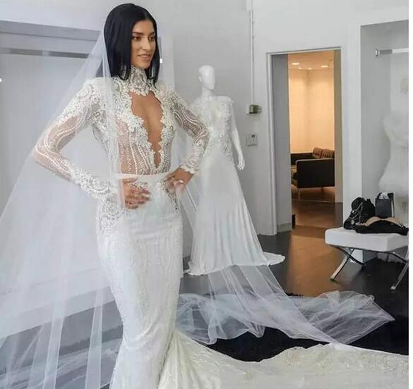 235 99 High Neck Long Sleeves 2019 Mermaid Wedding Dress Lace
