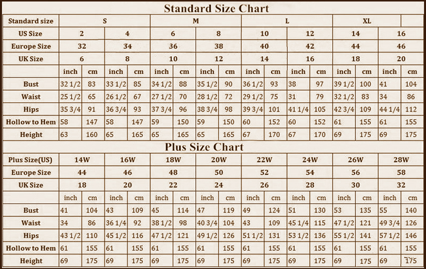 Woman Standard Size Chart And Custom Size Chart For Formal Evening