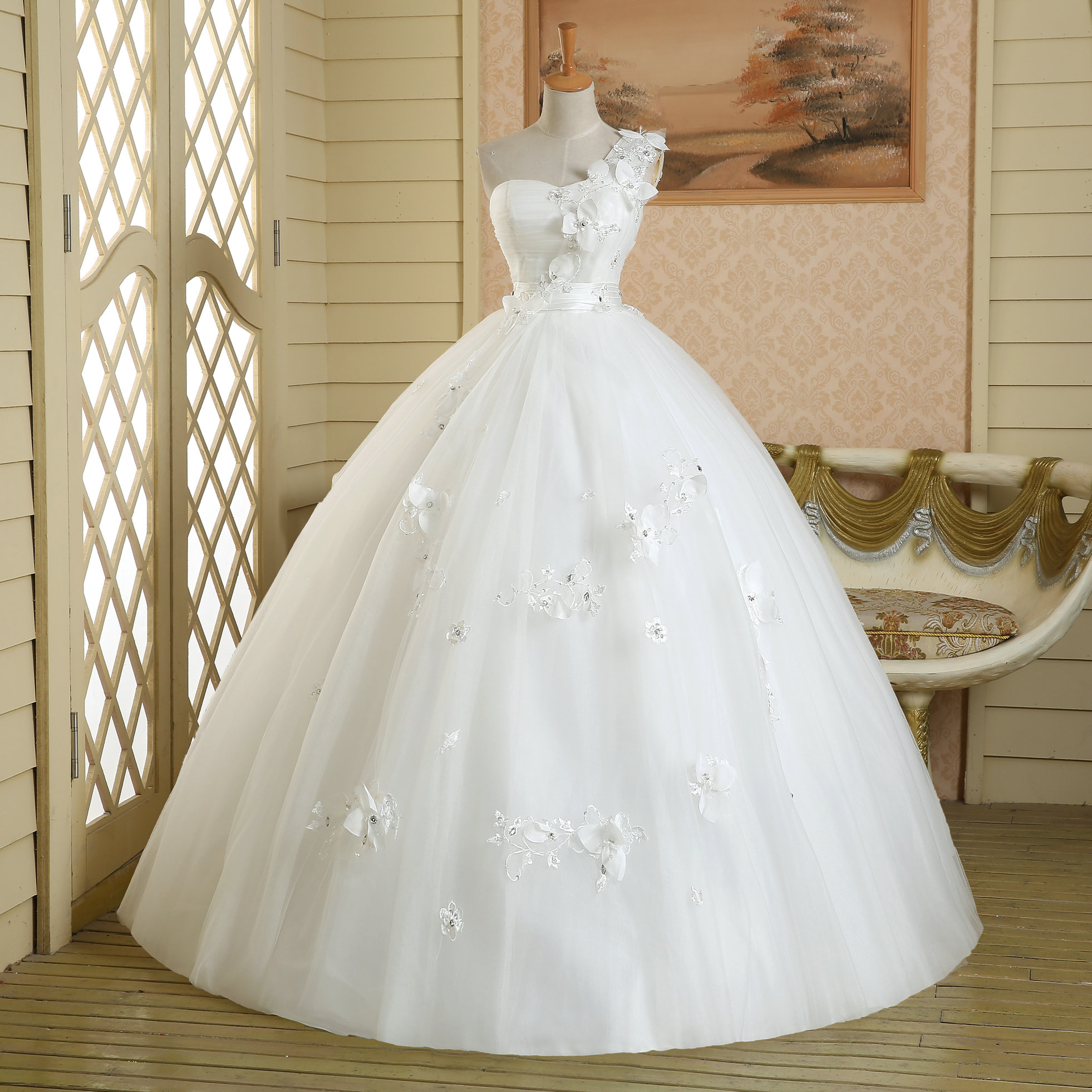 One Shoulder Hand Made Custom Tulle Lace Up Plus Size Ball Gown