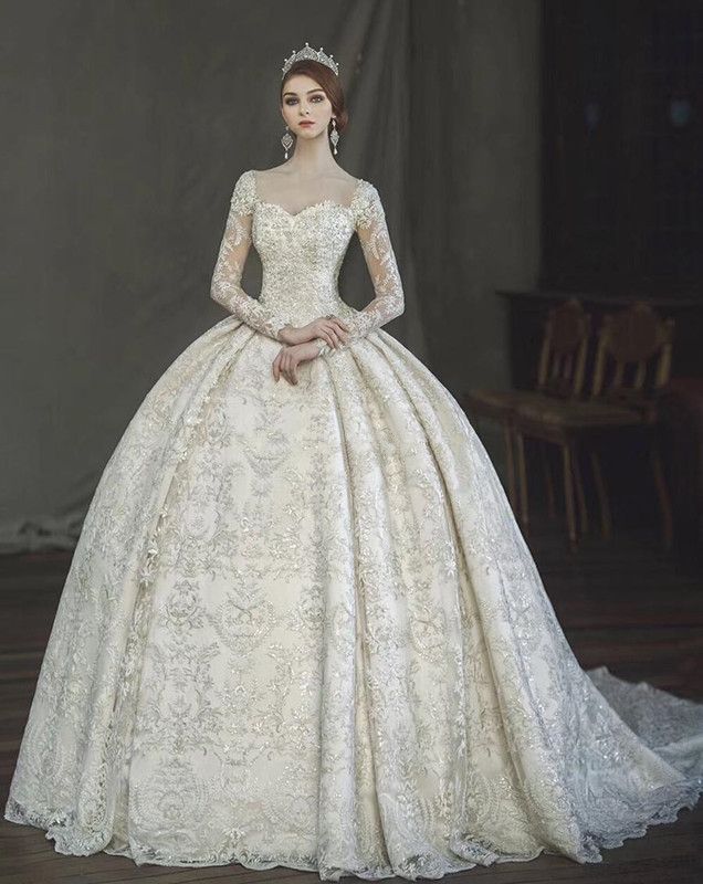 New Luxury Bling Lace Ball Gown Wedding Dresses Sheer Neck Chapel