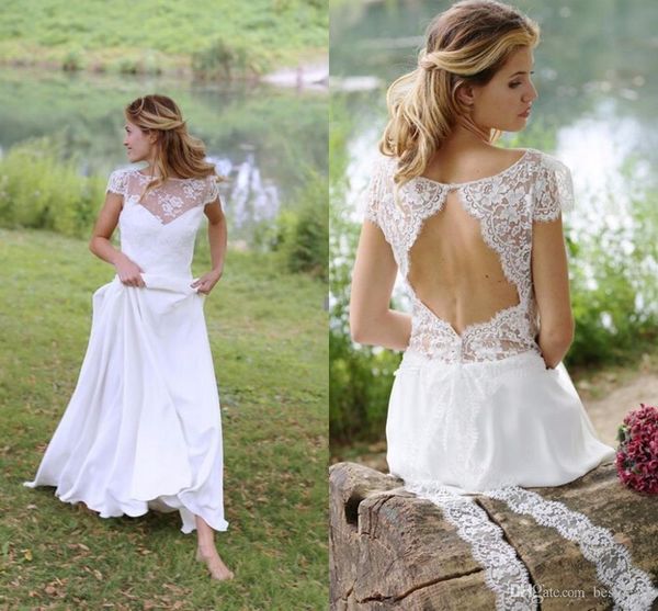 H1534 Simple Illusion Lace Back Chiffon Beach Flowy Wedding Dress