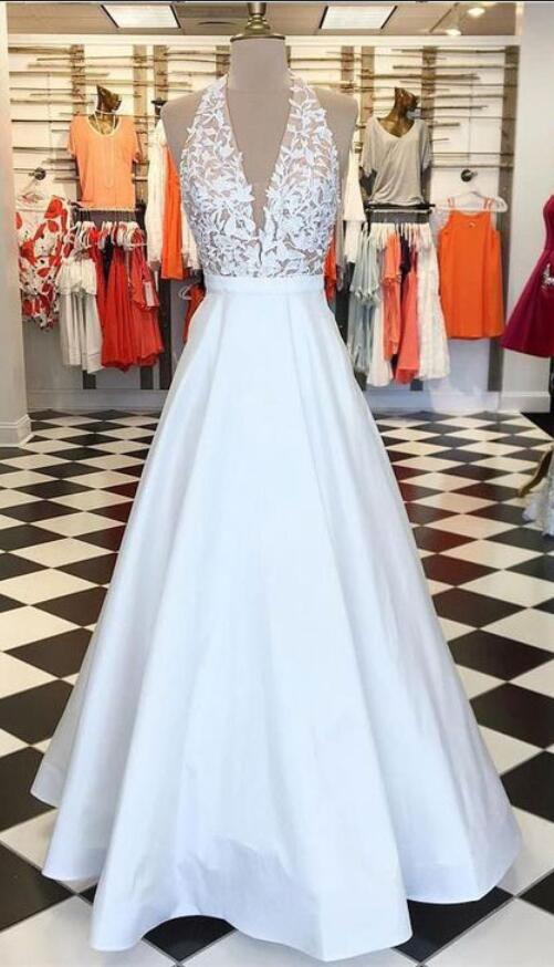 P1290 Sexy V Neck Halter White Long Prom Dresses With Appliques