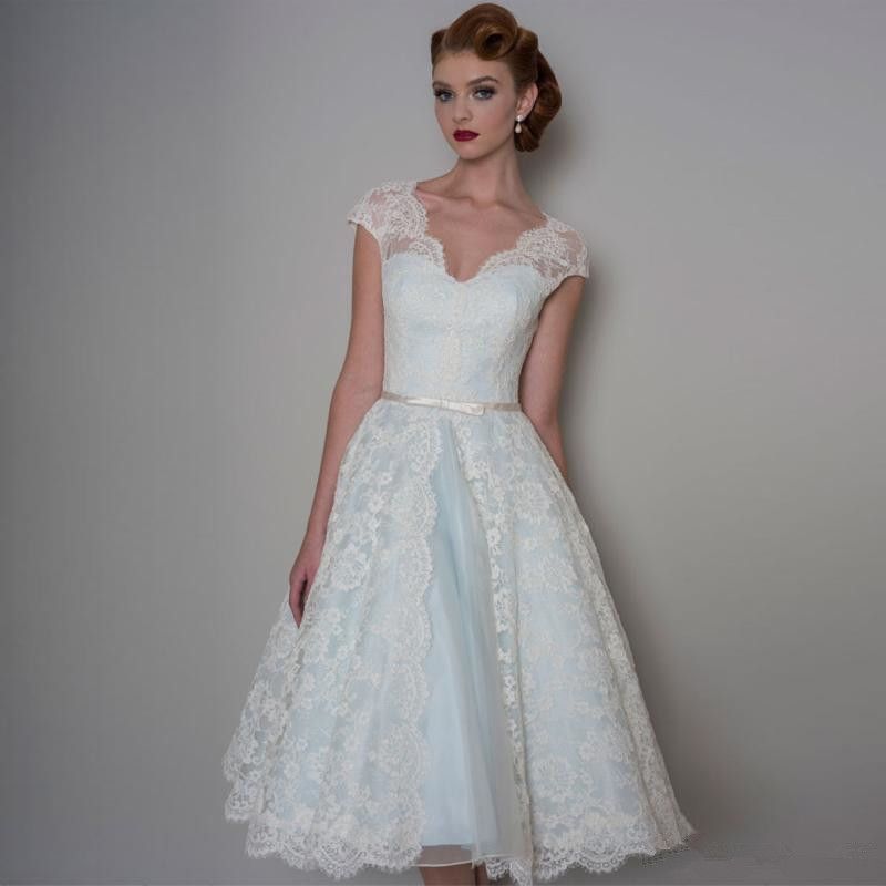 Vintage Short Wedding Dresses Cap Sleeve Lace Tea Length Bridal
