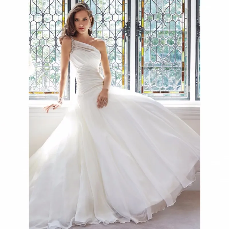 Beaded Strap One Shoulder Tulle Pleat Sweetheart Neckline Dropped